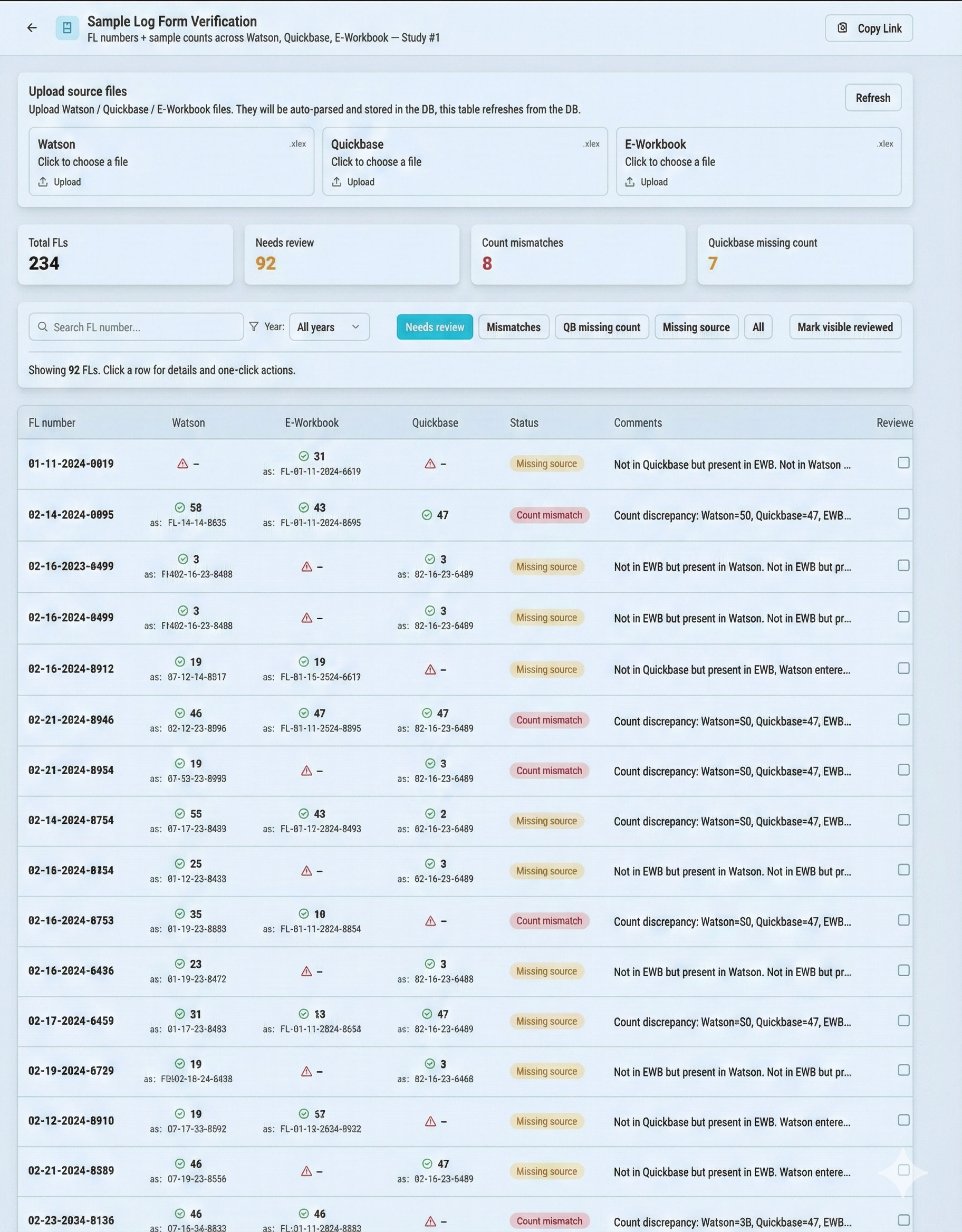 Seamlessly pull and compare data from Watson, Quickbase, and SharePoint to resolve mismatches instantly.